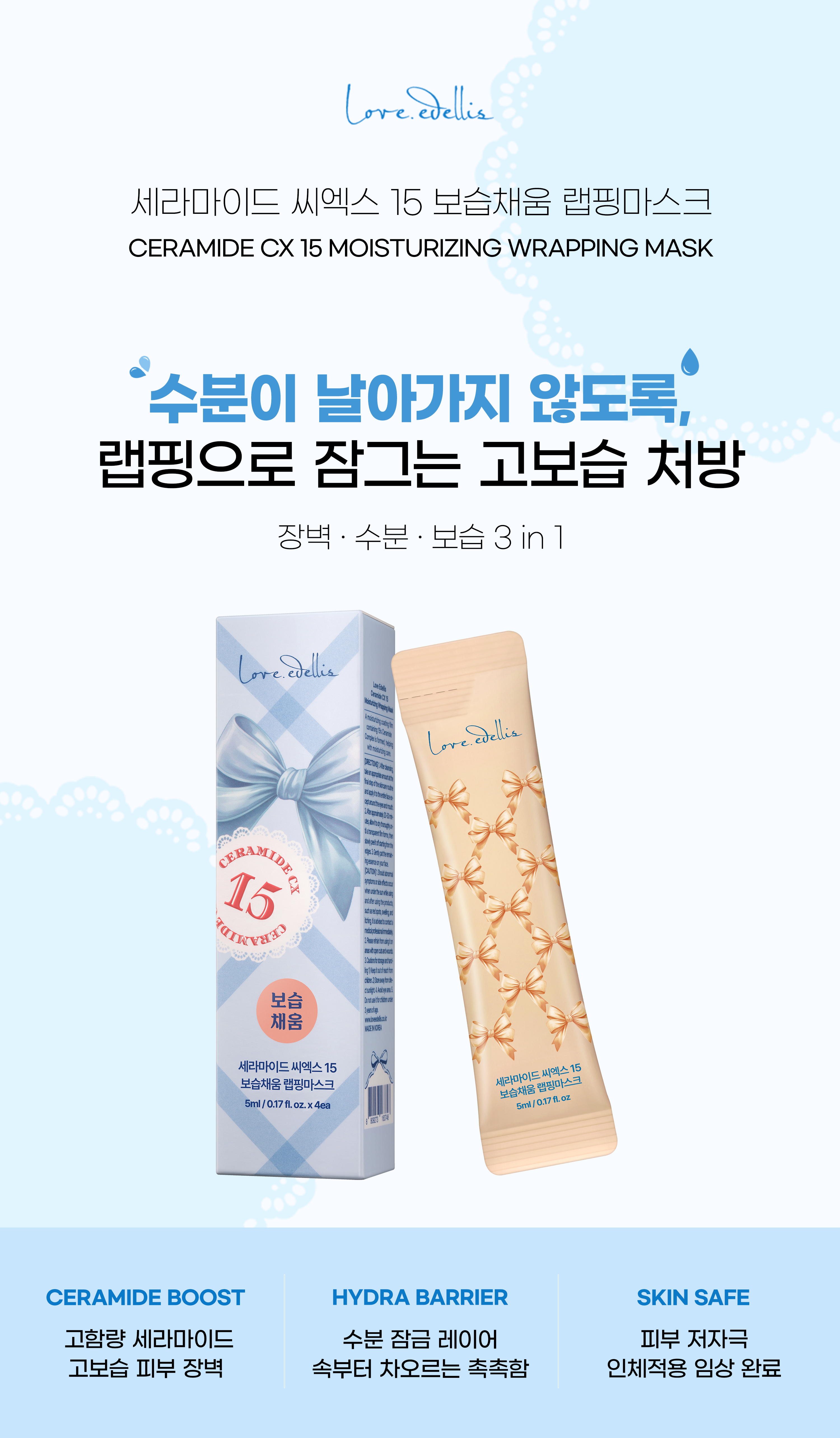 고순도 세라마이드 15%로 수분이 빠져나가지 않도록 한층 강화된 고기능성 보습 랩핑마스크